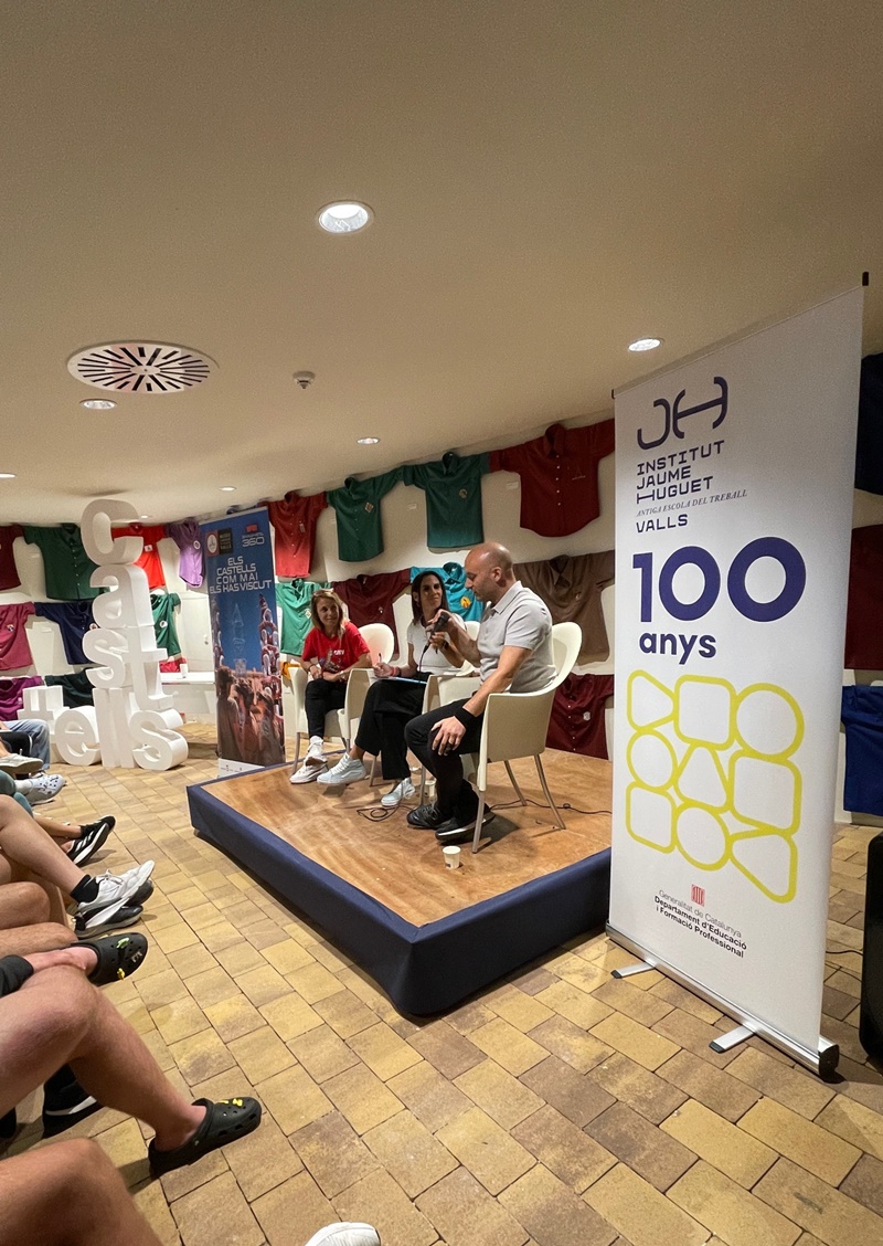 Els exalumnes Joan Ibarra Rodríguez (Batxillerat), expresident de la Colla Vella dels Xiquets de Valls, i Helena Llagostera Serra (Formació professional), excap de la Colla Joves Xiquets de Valls, han conversat amb la periodista Aina Mallol Capellà sobre els valors dels castells en el món educatiu.