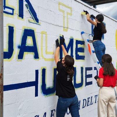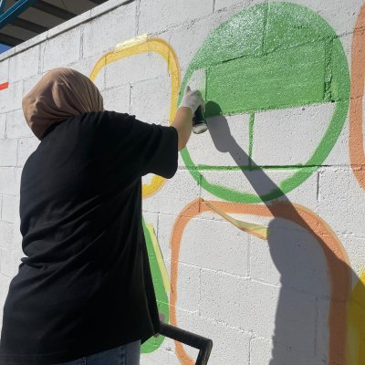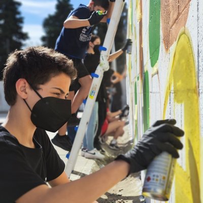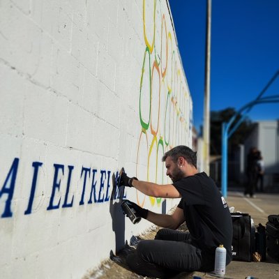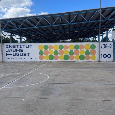 A més, durant tot el matí, es va pintar un mural al pati amb el logotip dels 100 anys del centre, dissenyat per Núria Arbonès i Guinovart del Morell (notícia aquí)
