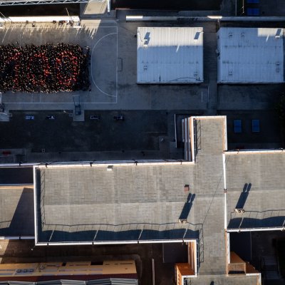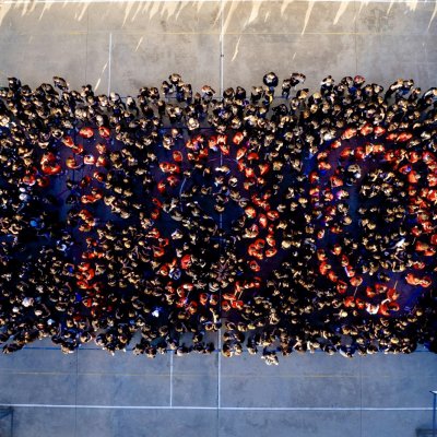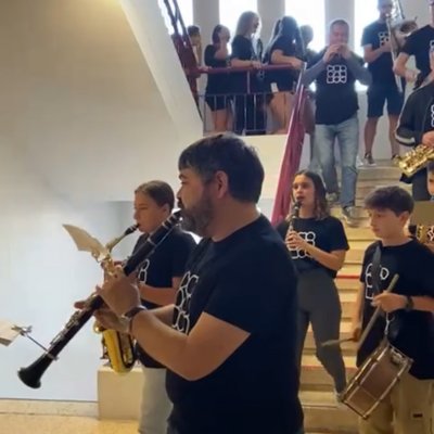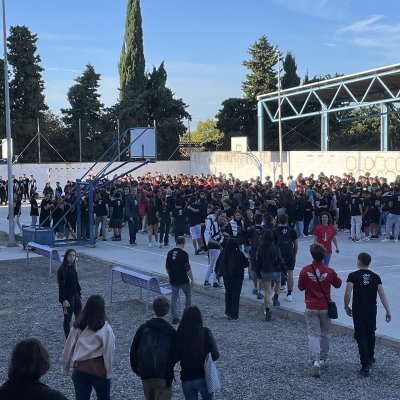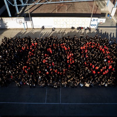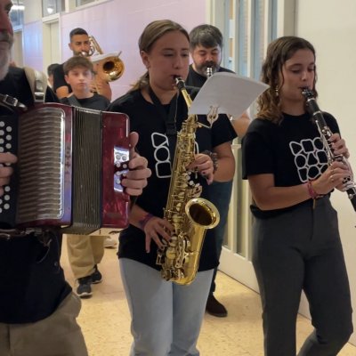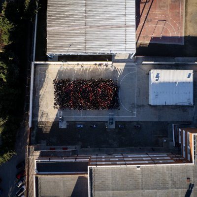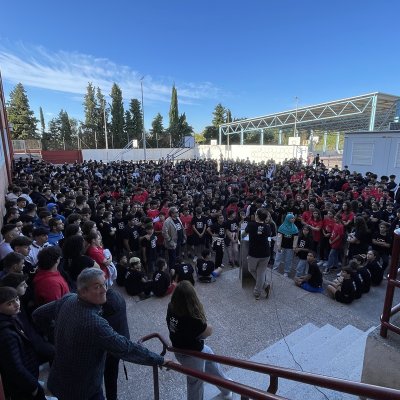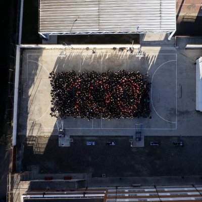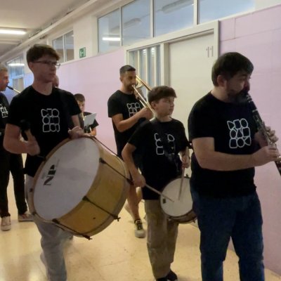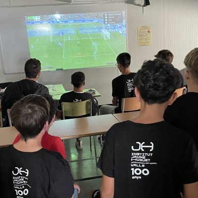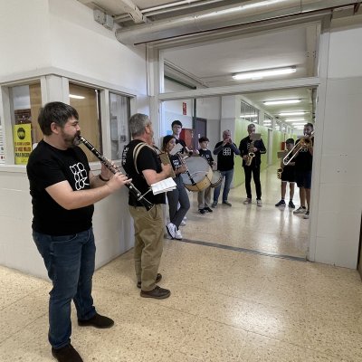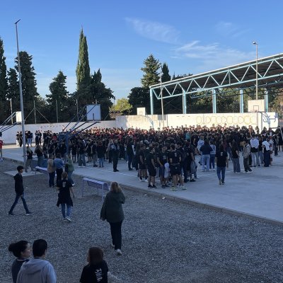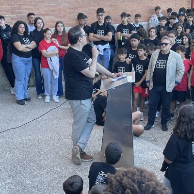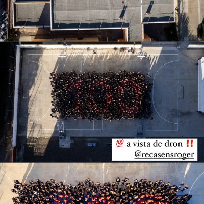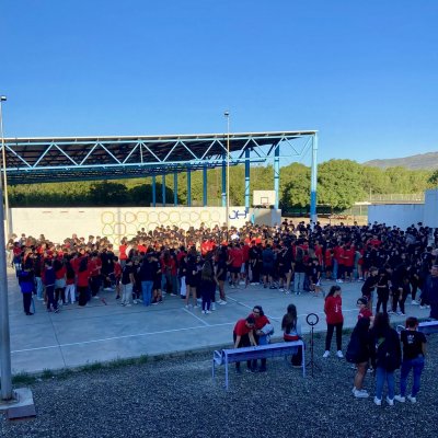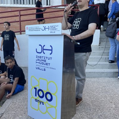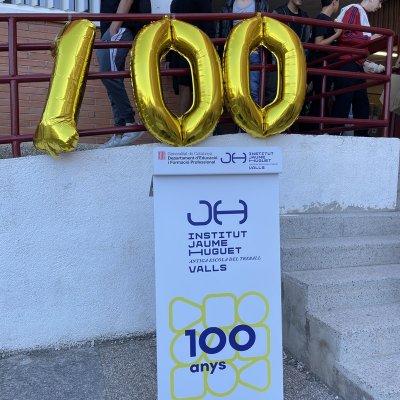 El passat 11 d’octubre al matí vam celebrar el centenari de l’Institut amb l’alumnat. A les 9, la xaranga (vídeos) va anat convidant els alumnes a baixar al pati per preparar el número 100 amb les dues samarretes del centre, la negra del centenari i la vermella de les jornades esportives.