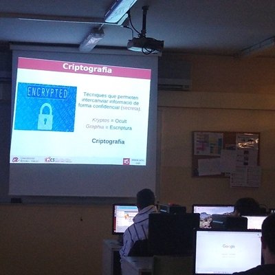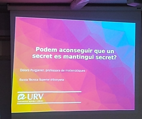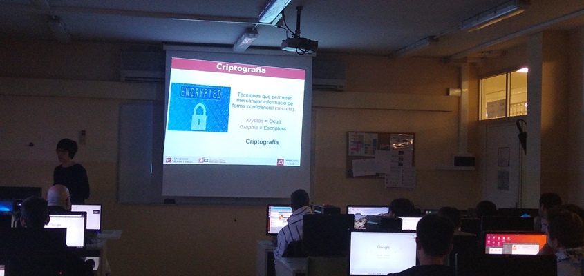 Aquest és el títol de la xerrada que Dolors Puigjaner ha fet avui, 24 de gener, al nostre centre. Puigjaner, professora del Departament de Matemàtiques de l’Escola Tècnica Superior d'Enginyeria (ETSE) de la Universitat Rovira i Virgili, ha explicat conceptes essencials de criptografia als alumnes de 2n del CFGM de Sistemes microinformàtics i xarxes. A més, han pogut posar en pràctica els coneixements apresos a través d’un joc d’encriptació i desencriptació que ha animat molt l’alumnat, ja que han hagut de competir entre ells per aconseguir descobrir el missatge secret ocult.
