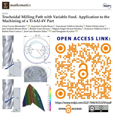 El fresat trocoidal és una estratègia de mecanitzat ben establerta que encara permet la realització d’introducció de nous enfocaments. Aquesta estratègia es pot aplicar a qualsevol tipus de material, encara que generalment va associada a materials avançats com ara els aliatges de titani i níquel. Aquest estudi es basa en l'adaptació de la velocitat d'alimentació d'una eina de fresat amb Ti-6Al-4V, de manera que es pot mantenir l'amplada constant sense modificar la geometria del recorregut. Una singularitat en l'etapa experimental es va aconseguir amb una ranura espiral d'Arquimedes en lloc de les ranures rectes convencionals. Això va fer possible obtenir una paret còncava i una altra convexa, i optimitzar la quantitat de material utilitzat. El temps d'eficiència, en comparació amb una trajectòria constant, va ser lleugerament superior al 20%, i es va reduir també el desgast de l'eina. Aquestes tècniques requereixen fresadores amb altes prestacions mecàniques i cinemàtiques, a més d’absència de joc entre les juntes i una elevada capacitat d'acceleració.