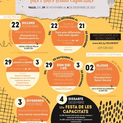 Del 29 de novembre al 4 de desembre, Valls commemora el Dia Internacional de les Persones amb Diversitat Funcional amb la 9a Setmana de les Capacitats; està organitzada per les entitats vallenques que treballen amb aquest col·lectiu a través de la Taula de les Capacitats. La Setmana arrenca amb actes de caire reivindicatiu, divulgatiu i festiu que s’allargaran fins al desembre.