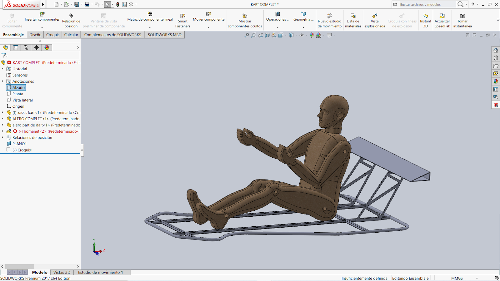 Des de la perspectiva de disseny, els alumnes del CFGS de Disseny en Fabricació Mecànica han començat a treballar en la fase de disseny i estudi del xassís del kart i en l’estudi ergonòmic de la posició de conducció del pilot. Tot això ho estan fent amb el software de disseny especialitzat SolidWorks.