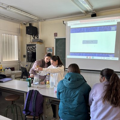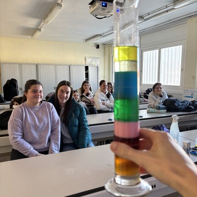 La Isona, que actualment està cursant el grau de Farmàcia a la UB, ens va parlar de la seva trajectòria, de la seva participació en iniciatives que estimulen la vocació més enllà de l'institut, dels dubtes i inquietuds a l'hora d'escollir el batxillerat i també de totes les coses bones que va viure durant aquesta etapa. A més va dur a terme una part pràctica que consistia a preparar una columna de densitats, en la qual tot l'alumnat va participar.
