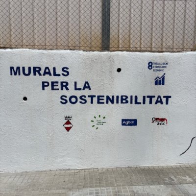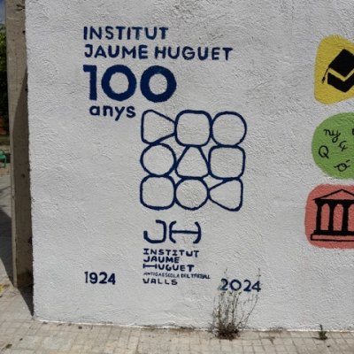 Aquest mes de maig hem acabat el mural de davant de l'Institut que tots podeu contemplar en una millora molt destacada que dignifica l'entorn del centre. Ja podem llegir a la part dreta del mural el títol i el número que li pertany, Murals per la sostenibilitat és el denominador comú a tots els murals dels diferents centres educatius de Valls. El número 8: treball digne i creixement econòmic, és el que correspon a l’Institut Jaume Huguet com a Antiga Escola del Treball i en representació de la seva realitat actual. L'acompanyen els logotips de les entitats que han col·laborat en la realització de l'itinerari de murals educatius. En ser el centenari de l'Institut a l'esquerra del mural hi ha el nom del nostre institut en el disseny actual del centenari. Tots els texts i aquests logos els han pintat els alumnes de segon de BAT de dibuix artístic.