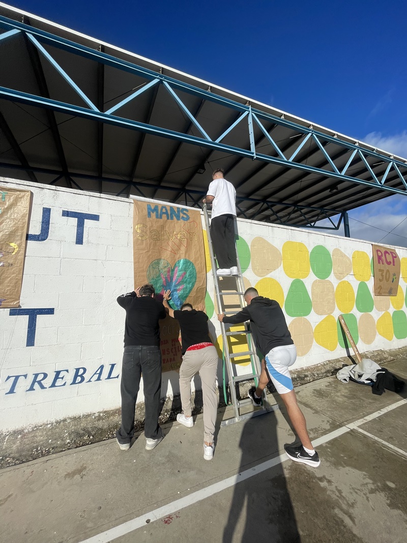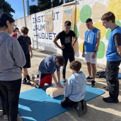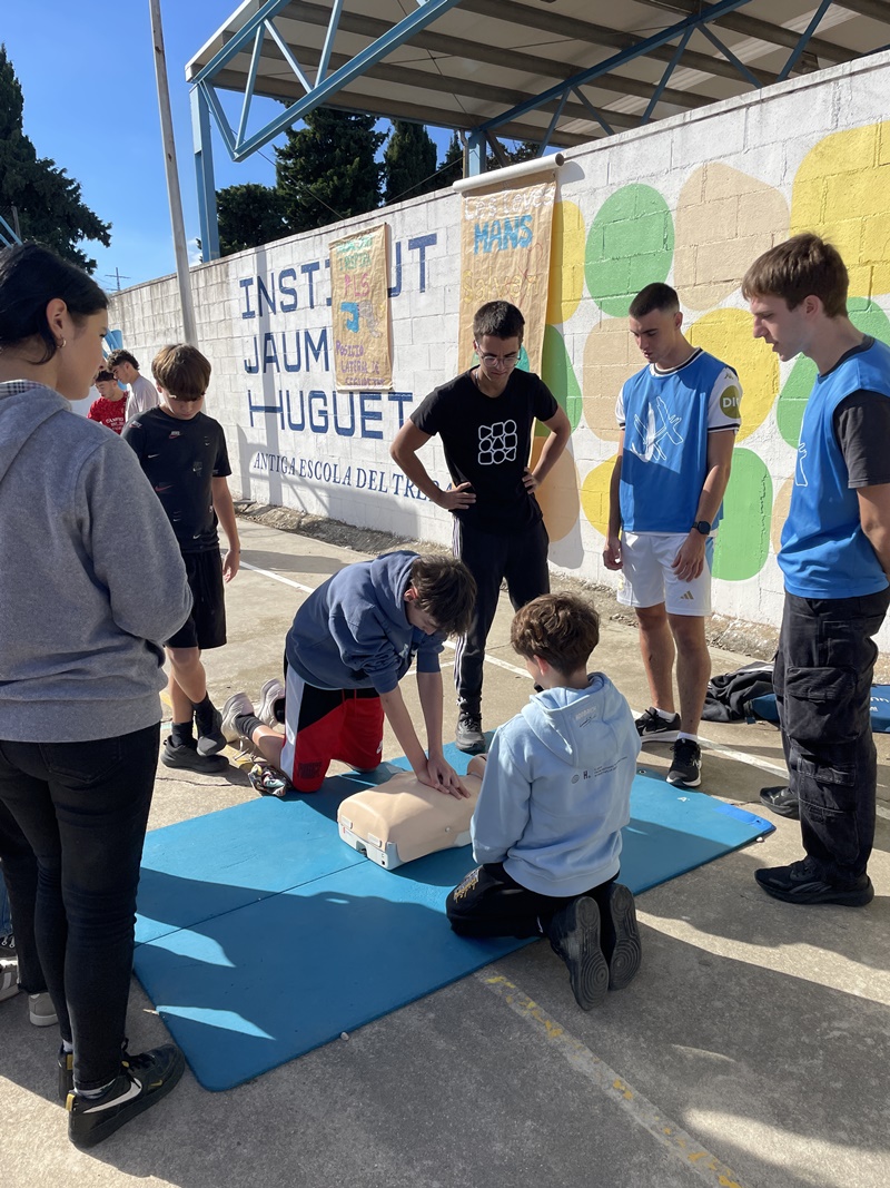 A continuació, juntament amb l'alumnat de CAI, es van fer tallers de Suport Vital Bàsic: PLS (posició lateral de seguretat), OVACE (obstrucció de la via aèria) i RCP (reanimació cardiopulmonar), distribuïts a prop de les parets que delimiten la zona de les pistes de bàsquet.