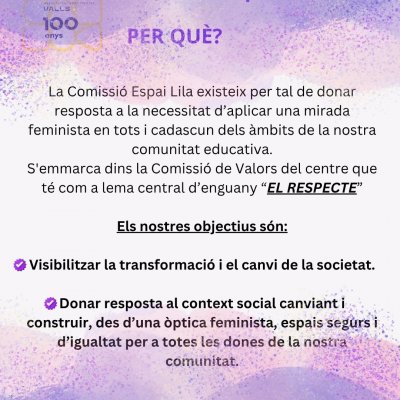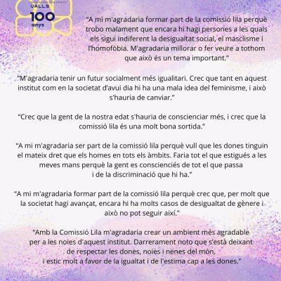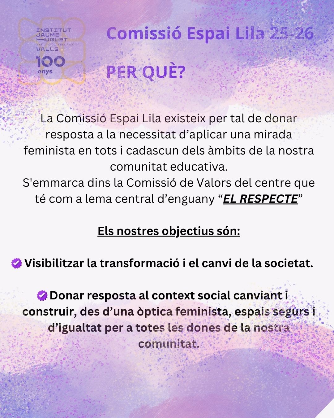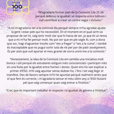 L’Institut Jaume Huguet ja té constituïda la Comissió Espai Lila d’enguany, formada per alumnes de diferents cursos d’ESO i per professorat. La Coordinació de la Comissió va oferir la possibilitat de formar-ne part a tots els alumnes d’ESO i BAT i, qui es va presentar com a voluntari, va explicar els seus motius.