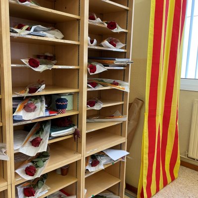 Per Sant Jordi, roses! Així és com els professors del centre van començar a viure la Diada a l'Institut ja que se’ls va fer arribar com cada any la tradicional rosa de Sant Jordi, per donar caliu a la Diada.