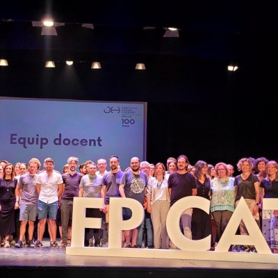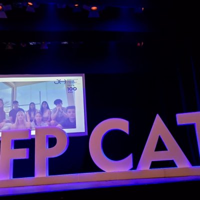 Els alumnes del programa d’Erasmus de Mobilitat Internacional amb la finalitat de millorar la seva capacitació professional que estan fent l’estada a Sicília IRIS ABAD GRAU, SAMANTHA FIGUEROLA TING, PABLO LÓPEZ RAMIREZ, JURIMA MACIAS MONTAÑO, JOANA MARTÍ PRATS, SLEITER MOYANO MORALES, ÈRIC RUBIO VERGES i CARLA SOLER DOMINGO, van preparar un vídeo per a la resta de companys, el qual va donar pas a la fotografia que tot el professorat es va fer a l’escenari.
