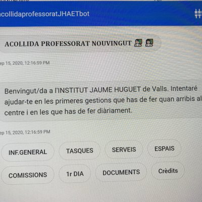 En primer lloc, hem unificat el Servei. de Recursos i Suport TIC (SRiSTIC) i la Comissió TAC, i els hem transformat en la nova Comissió d’Estratègia Digital. Un dels primers resultats visibles d’aquesta comissió ha estat la preparació, durant l’estiu, d’un xatbot d’acollida al professorat nou en el centre, que li permet de conèixer el funcionament de l’Institut i el guia en els problemes del seu dia a dia.