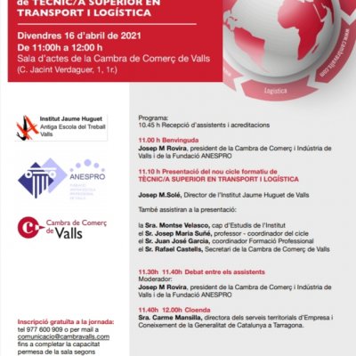 Avui, 16 d’abril, s’ha presentat a la Cambra de Comerç i Indústria de Valls el nou CFGS de Transport i Logística que s’impartirà el curs vinent a l’Institut Jaume Huguet.