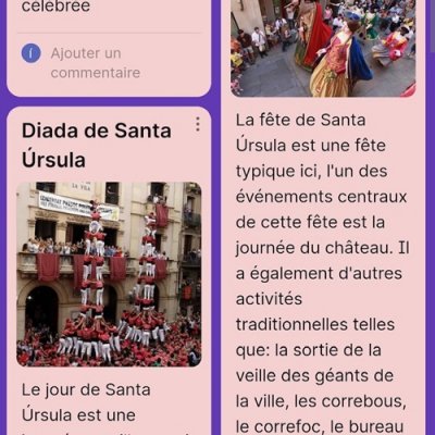 Dans cette VIII Semaine des Langues étrangères au lycée Jaume Huguet, dès le département de français, on a fait différentes activités avec toutes les classes, telles que créer un avatar, créer un itinéraire virtuel par les Châteaux de la Loire, créer l'itinéraire virtuel de Paris qu'on réalisera en vrai le mois de mars, ainsi que des activités reliées avec nos projets etwinning : vidéo pour présenter notre lycée, présenter la fête traditionnelle de la Sainte Ursule et présenter la Castanyada, toutes les présentations via Padlet.