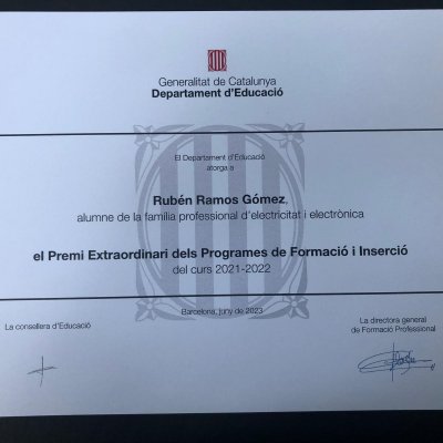 El nostre alumne Rubén Ramos Gómez, amb una qualificació mitjana de 9,40, va obtenir el premi extraordinari d'FP dels PFI de la família professional d'Electricitat i electrònica; va recollir el diploma el seu tutor, Arnau Bonet.