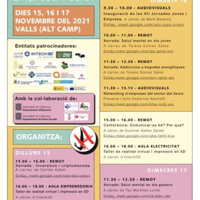 Us presentem els actes de les XII Jornades Joves i Empresa, centrades enguany en la salut! En destaquem, a més, el networking, i els tallers de realitat virtual i eines de prototipatge per fomentar l'emprenedoria.