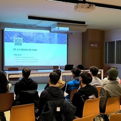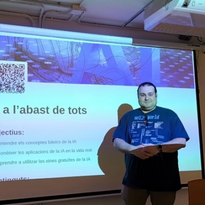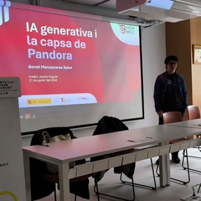 Les activitats van continuar a l’Institut mateix amb la xerrada "Intel·ligència artificial (IA) a l'abast de tothom" a càrrec de Xavier León, professor del centre, que estava destinada als alumnes dels CFGS d’informàtica. El Xavier els va explicar conceptes teòrics sobre la IA i eines d’IA gratuïtes de generació de codi de programació, eines d'edició de vídeo i generació d'imatges, etc. Els alumnes van riure molt amb les imatges generades per la IA i van posar a prova el ChatGPT per saber si era certa la resposta donada a un plantejament.