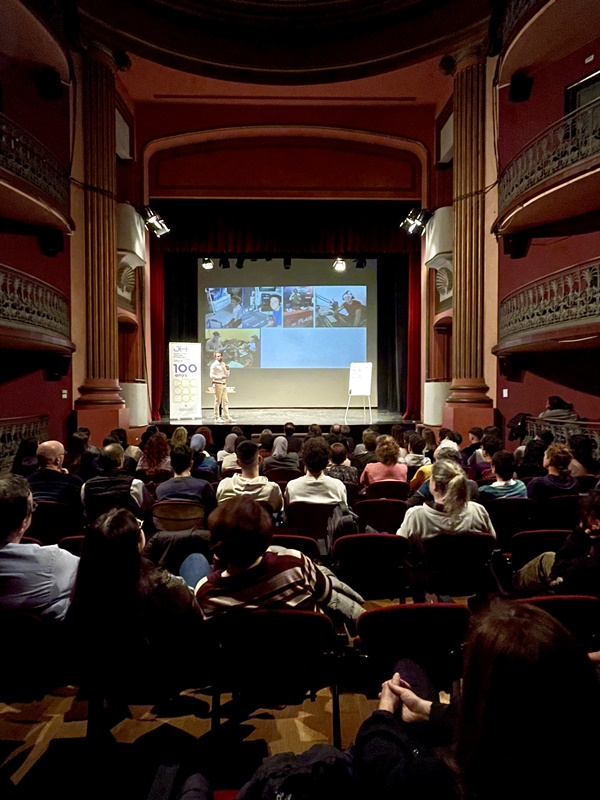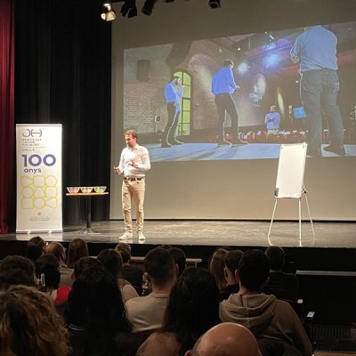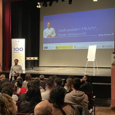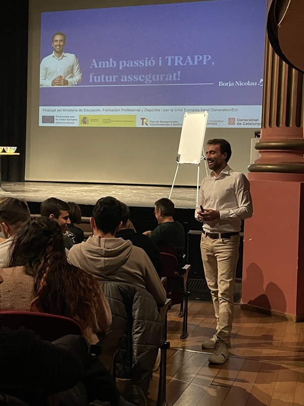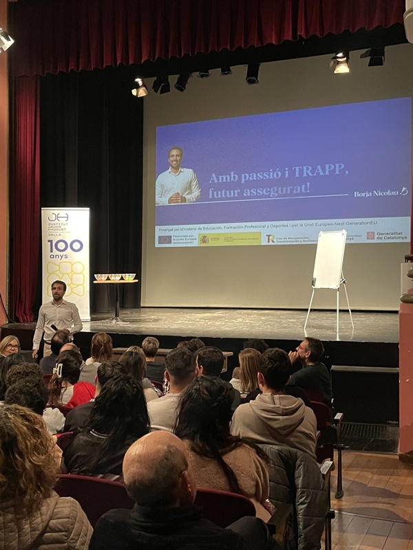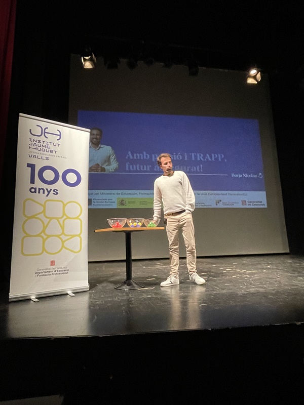 El 27 de novembre es va fer al Teatre Principal un altre dels actes del centenari de l’Institut. “Amb passió i TRAPP tens un bon futur assegurat” va ser el títol que el conegut comunicador i còmic Borja Nicolau va donar a la xerrada sobre la inserció en el món laboral.