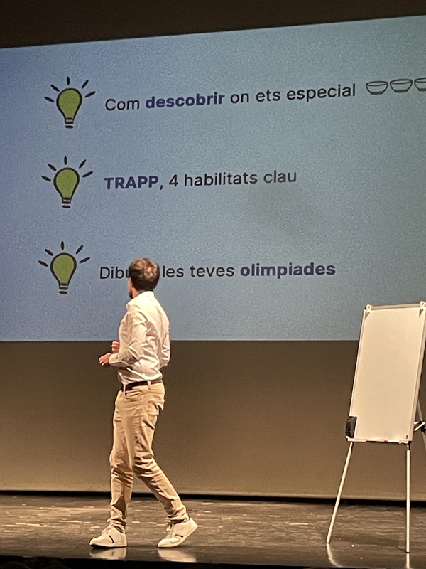 Especialment va destacar el que ell anomena TRAPP, que no és el ritme musical sinó que són les sigles del que cal tenir en compte a l’hora de plantejar-se el futur laboral: TRencar nos el cap per tenir en compte totes les nostres habilitats, Atenció a tot allò que ens envolta, Positivisme per encarar la vida en general i Paciència perquè les oportunitats no sempre ens arribaran a la primera.