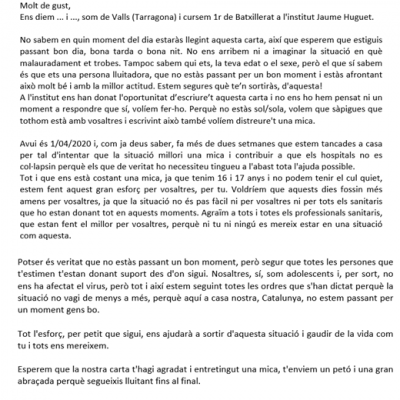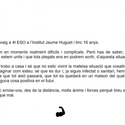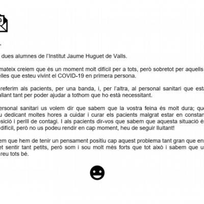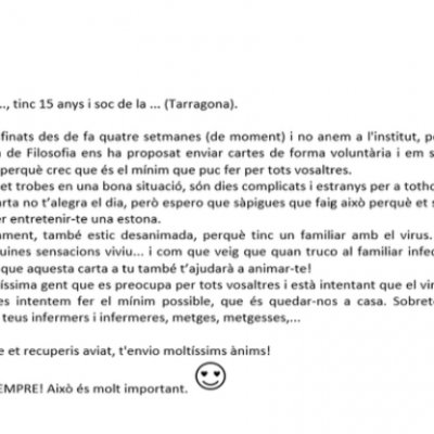 L’alumnat de les matèries de Filosofia de 4t d’ESO, i de Sociologia de 1r de Batxillerat, durant aquesta tercera setmana de confinament, s’ha sumat voluntàriament a la iniciativa promoguda tant pel Departament d’Educació com pel Departament de Salut de la Generalitat de Catalunya amb la iniciativa “Cartes amb cor. Sanitat i Educació bateguem juntes.”