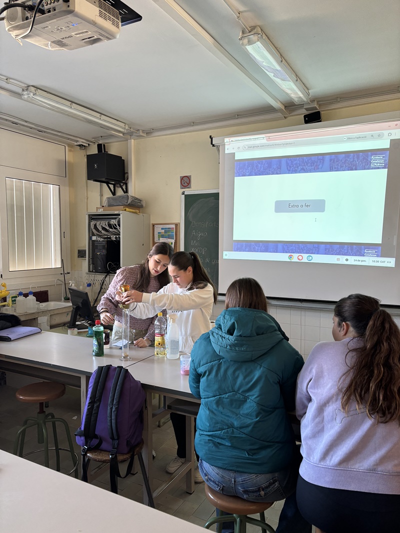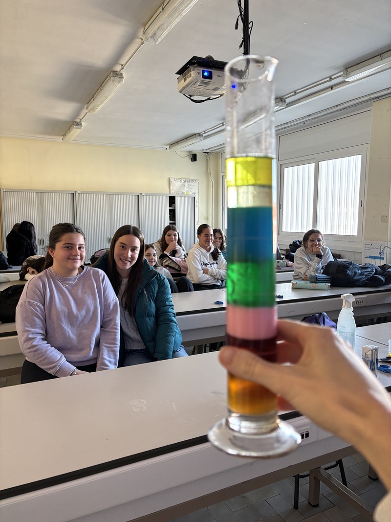 La Isona, que actualment està cursant el grau de Farmàcia a la UB, ens va parlar de la seva trajectòria, de la seva participació en iniciatives que estimulen la vocació més enllà de l'institut, dels dubtes i inquietuds a l'hora d'escollir el batxillerat i també de totes les coses bones que va viure durant aquesta etapa. A més va dur a terme una part pràctica que consistia a preparar una columna de densitats, en la qual tot l'alumnat va participar.