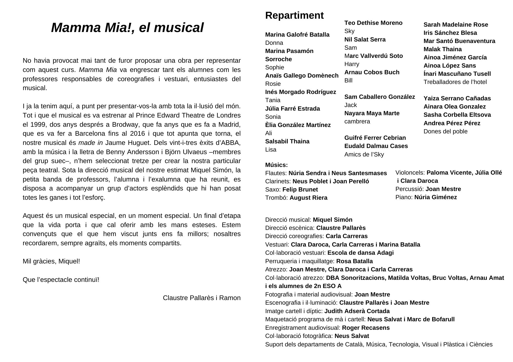 Enhorabona, actors, actrius, músics, tècnics, director musical, directora escènica! Heu fet una feina magnífica!