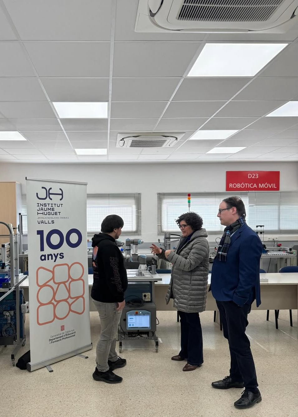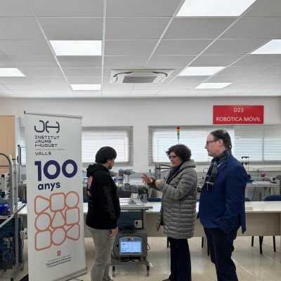 Durant la visita va posar en valor el paper del centre en el nostre teixit històric, educatiu i també empresarial, com a motor de creació d’empreses i ocupació de qualitat. Després de la signatura al llibre d’honor i d’una conversa distesa amb l’equip directiu, es va interessar per conèixer les aules tècniques de formació professional industrial, especialment les de robòtica col·laborativa i mecanitzat amb control numèric.