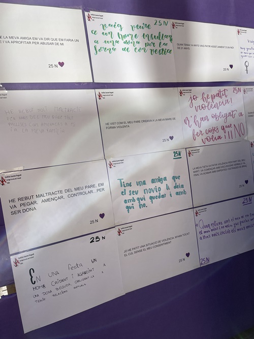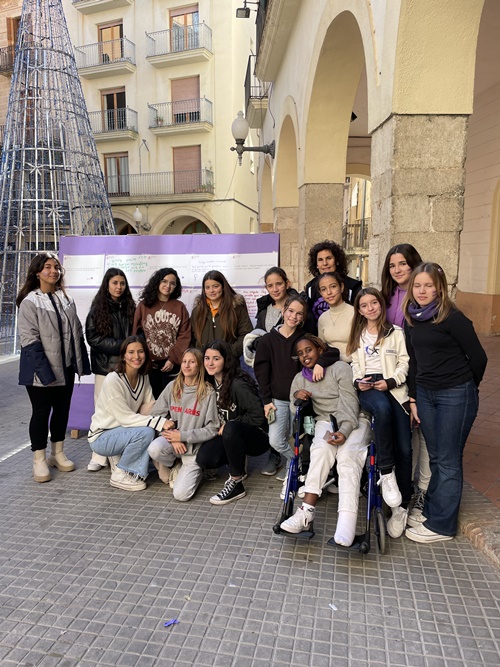 D’altra banda, les alumnes que formen part de la comissió Espai Lila JH van assistir a l’acte que es va fer amb motiu del Dia Internacional per a l’Eliminació de la Violència vers les Dones, que fou organitzat per la Regidoria d'Acció Comunitària, Participació i Igualtat de l’Ajuntament de Valls. Isona Ferré Cebrian, Carla Soler Domingo, Xènia Massip Ciurana, Txell March Domingo, Leire González Pérez, Coia Morera Galofré, Zebura Ferrer Marcos, Isona Morató Nogués, Alma de Arriba Manzano, Ona Llorach Llagostera, Naroa López Cuenca, Sara Taider Boumaza, Anna Boades Segú, Iris Sans Borràs, Claudia Escoda Domínguez i Dúnia Iglesias Rodríguez, acompanyades per la professora Sara Álvarez, van anar a la plaça del Blat, on van penjar cartells reivindicatius del 25N i van participar en la lectura del manifest juntament amb altres centres de secundària de la ciutat.