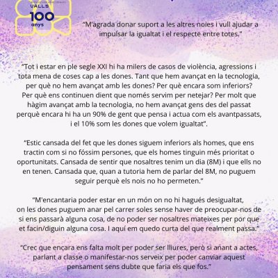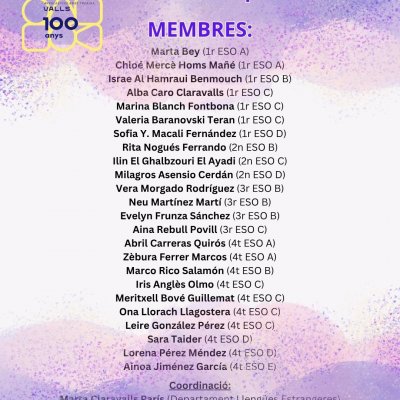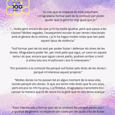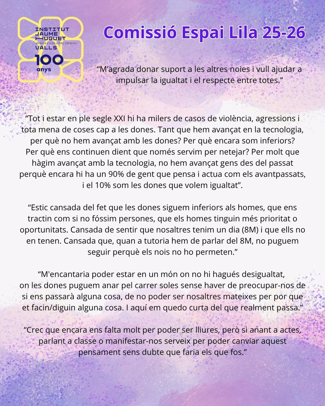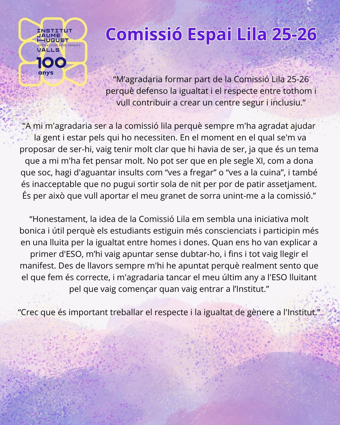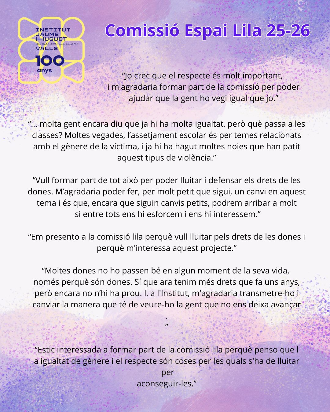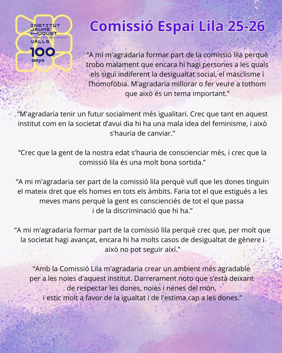 L’Institut Jaume Huguet ja té constituïda la Comissió Espai Lila d’enguany, formada per alumnes de diferents cursos d’ESO i per professorat. La Coordinació de la Comissió va oferir la possibilitat de formar-ne part a tots els alumnes d’ESO i BAT i, qui es va presentar com a voluntari, va explicar els seus motius.