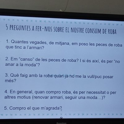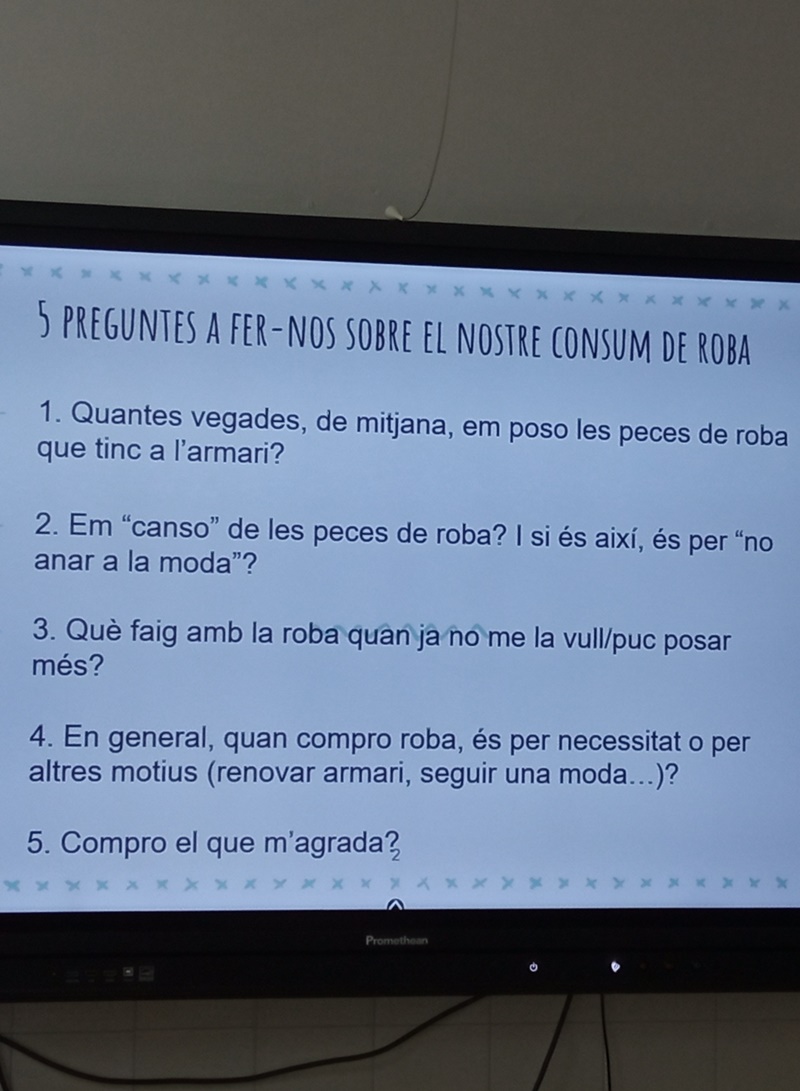 A 1r i 2n els han parlat sobre la sobirania alimentària i s'han familiaritzat amb conceptes com productes locals, de temporada, km 0, etc. Els de 3r d'ESO han fet tallers sobre la moda sostenible: s’han introduït en el món de la indústria de la moda i s’han conscienciat de la necessitat de no fer-ne un consum excessiu.