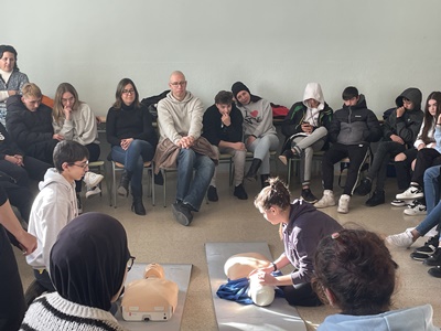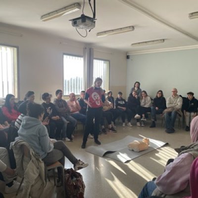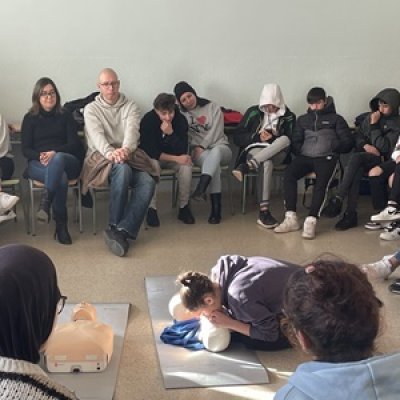 A la tarda, es van fer tallers de primers auxilis per a l’alumnat dels CFGS, organitzats per l’alumnat i el professorat de Cures Auxiliars d’Infermeria.