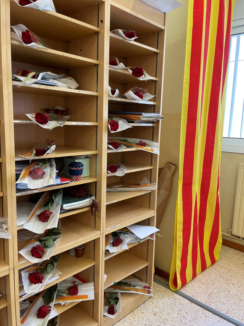 Per Sant Jordi, roses! Així és com els professors del centre van començar a viure la Diada a l'Institut ja que se’ls va fer arribar com cada any la tradicional rosa de Sant Jordi, per donar caliu a la Diada.