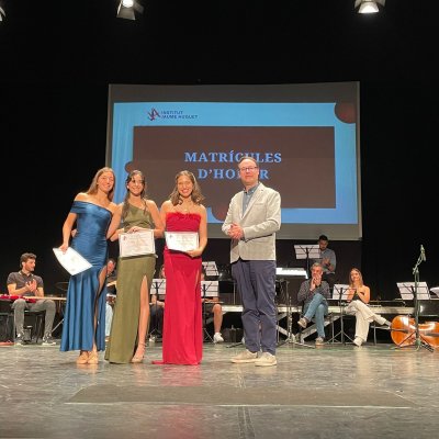 Tot seguit, un altre dels moments especials de tota graduació de Batxillerat, el moment de reconèixer l’excel·lència dels millors expedients: el director, Josep Maria Soler, va lliurar el diploma que reconeix les tres Matrícules d’Honor de Batxillerat que pot concedir el centre a Clara Cano, Isona Ferré i Helena Jubany. Enhorabona, noies! (més info, aquí)