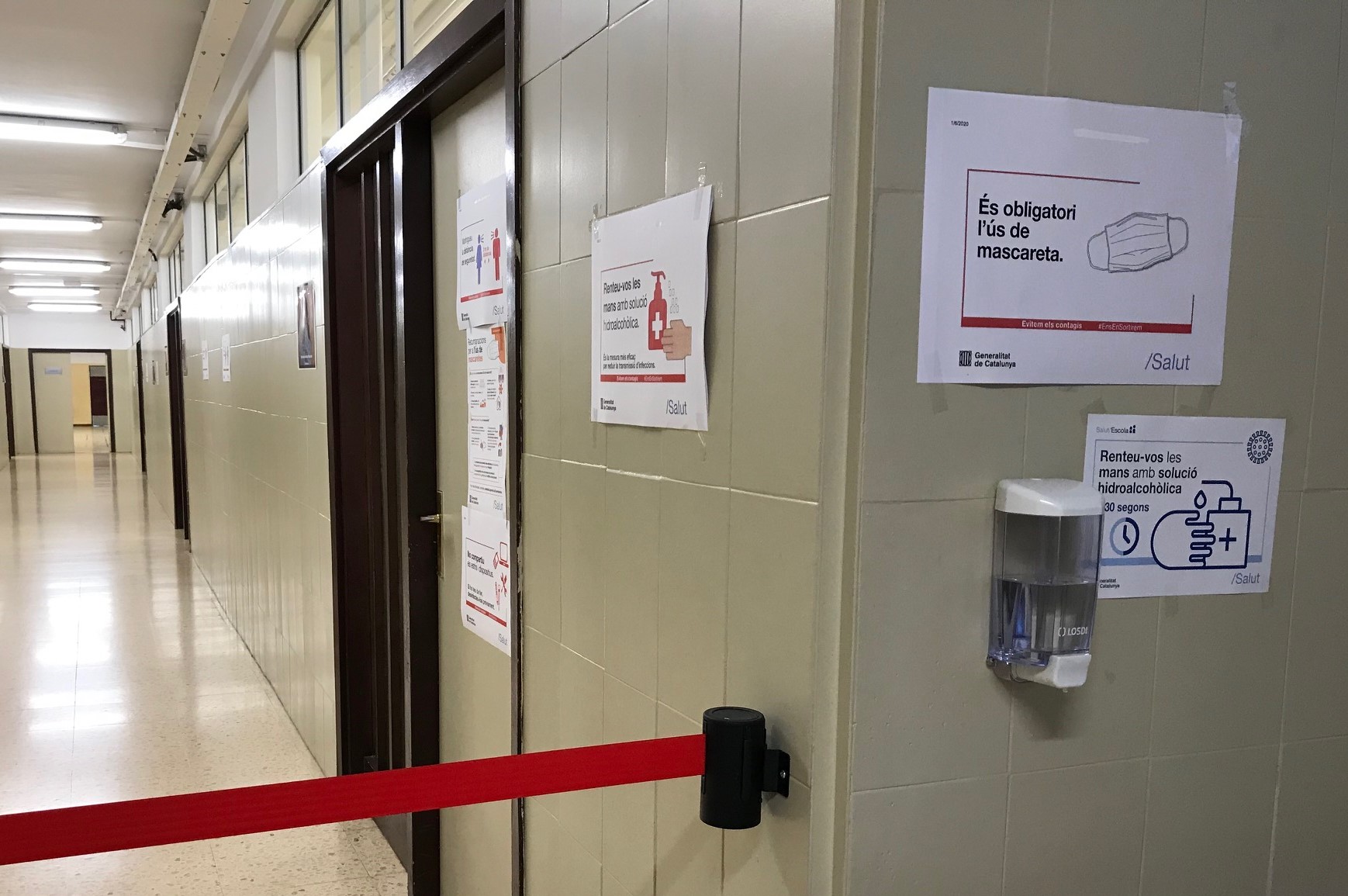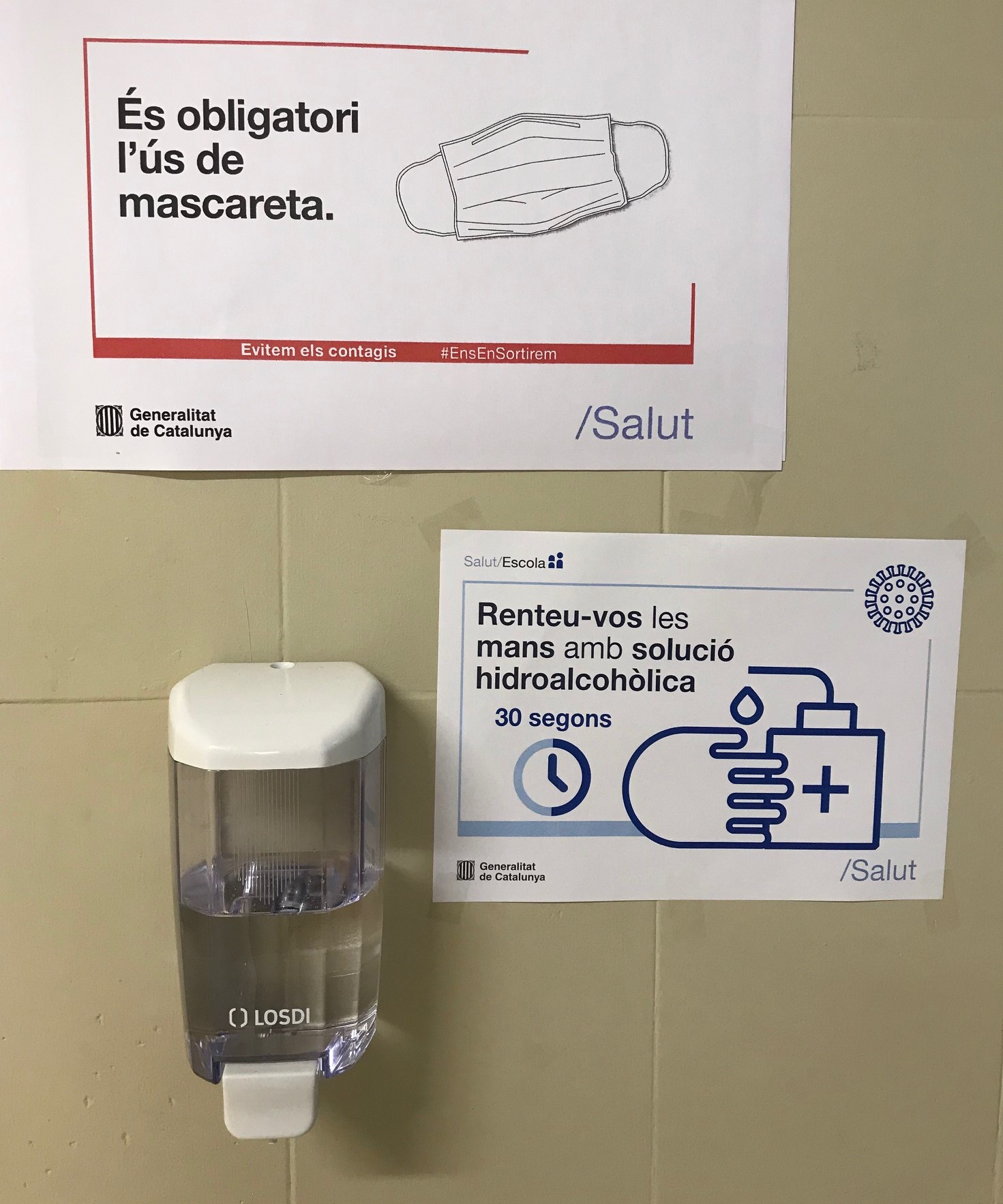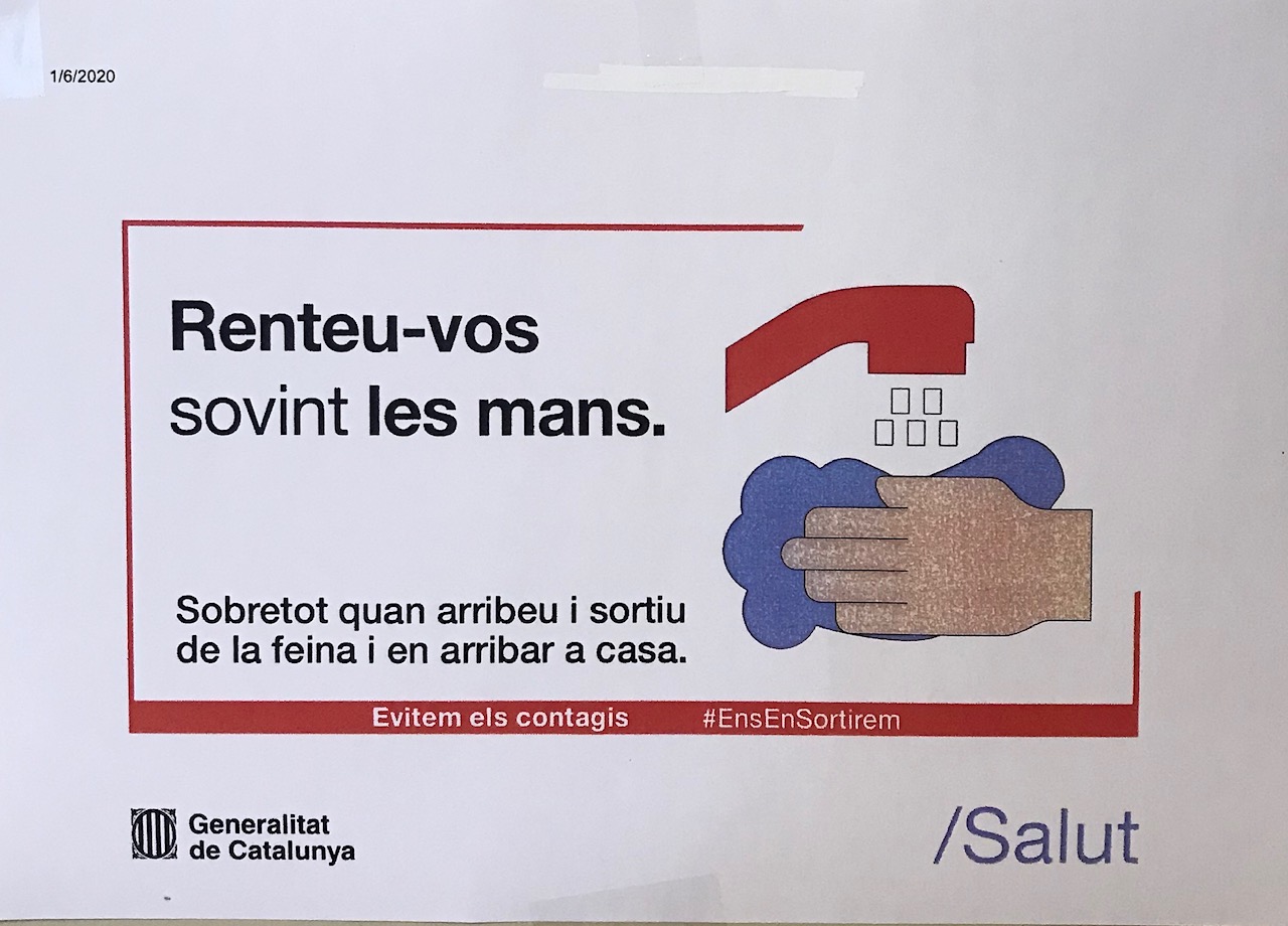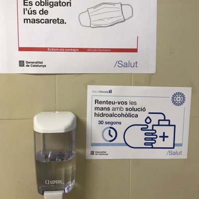 Tal com marquen els protocols, s’han adequat tots els espais del centre amb el que determina la normativa: líquids necessaris per desinfectar, rètols recordant les instruccions bàsiques (mans-distància-mascareta), accessos diversificats, etc.