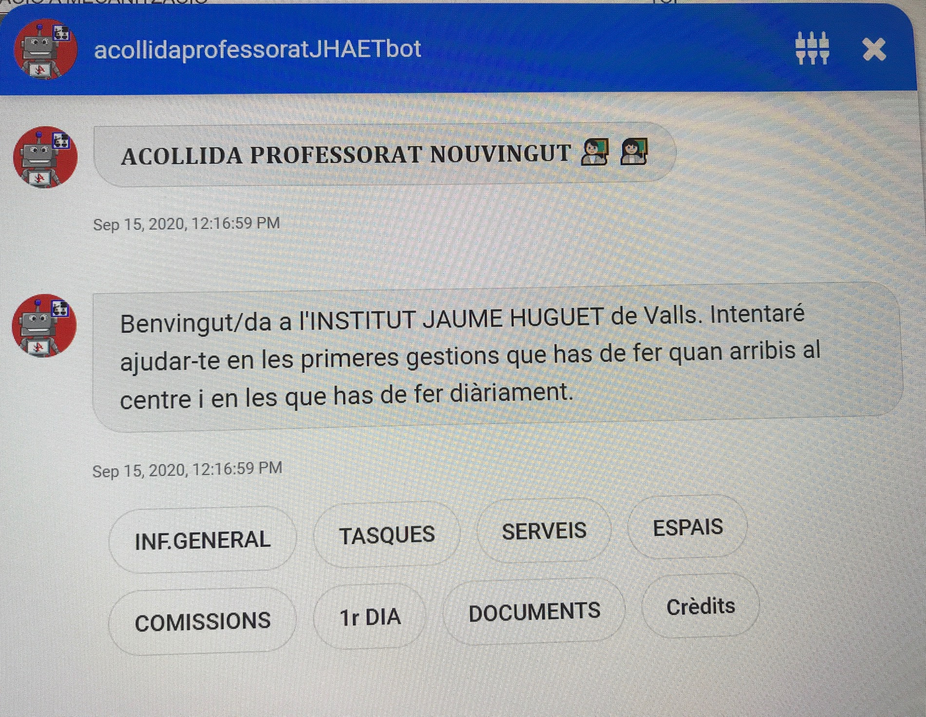 En primer lloc, hem unificat el Servei. de Recursos i Suport TIC (SRiSTIC) i la Comissió TAC, i els hem transformat en la nova Comissió d’Estratègia Digital. Un dels primers resultats visibles d’aquesta comissió ha estat la preparació, durant l’estiu, d’un xatbot d’acollida al professorat nou en el centre, que li permet de conèixer el funcionament de l’Institut i el guia en els problemes del seu dia a dia.