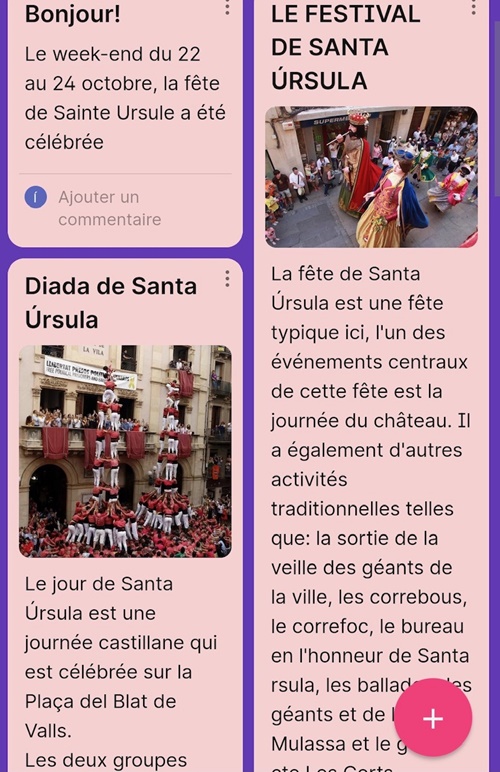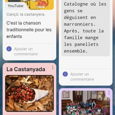 Dans cette VIII Semaine des Langues étrangères au lycée Jaume Huguet, dès le département de français, on a fait différentes activités avec toutes les classes, telles que créer un avatar, créer un itinéraire virtuel par les Châteaux de la Loire, créer l'itinéraire virtuel de Paris qu'on réalisera en vrai le mois de mars, ainsi que des activités reliées avec nos projets etwinning : vidéo pour présenter notre lycée, présenter la fête traditionnelle de la Sainte Ursule et présenter la Castanyada, toutes les présentations via Padlet.