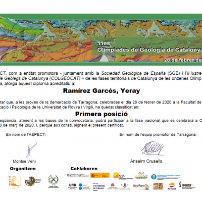 Yeray Ramírez Garcés va rebre el primer premi com a guanyador absolut de l’11a Olimpíada de Geologia, i el Joan Tous Valls i la Rosa Invernon Moragas van ser el 2n i 3r classificats respectivament de la fase territorial celebrada a Tarragona el 28 de febrer.