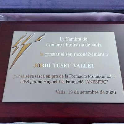 A més, la Cambra de Comerç i Indústria de Valls va fer un reconeixement especial al nostre exdirector Jordi Tuset Vallet per la seva tasca en pro de l’FP al centre i al davant de la Fundació ANESPRO, per millorar la preparació dels alumnes de cara a la incorporació en el món de l’empresa.