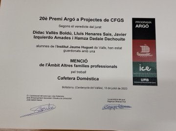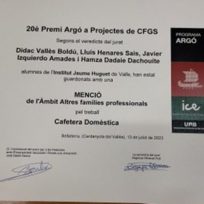 Aquesta tarda, a l'Edifici del Rectorat de la UAB, s'han lliurat els Premis Argó corresponents a la vintena edició. El projecte final intercicles dels CFGS Programació de la Producció en Fabricació Mecànica i de Disseny en Fabricació Mecànica titulat "Cafetera Domèstica", que han fet els nostres alumnes Dídac Vallès, Lluís Henares, Javier Izquierdo i Hamza Dadaie, ha estat guardonat amb la Menció Honorífica de l'àmbit d'altres famílies professionals.