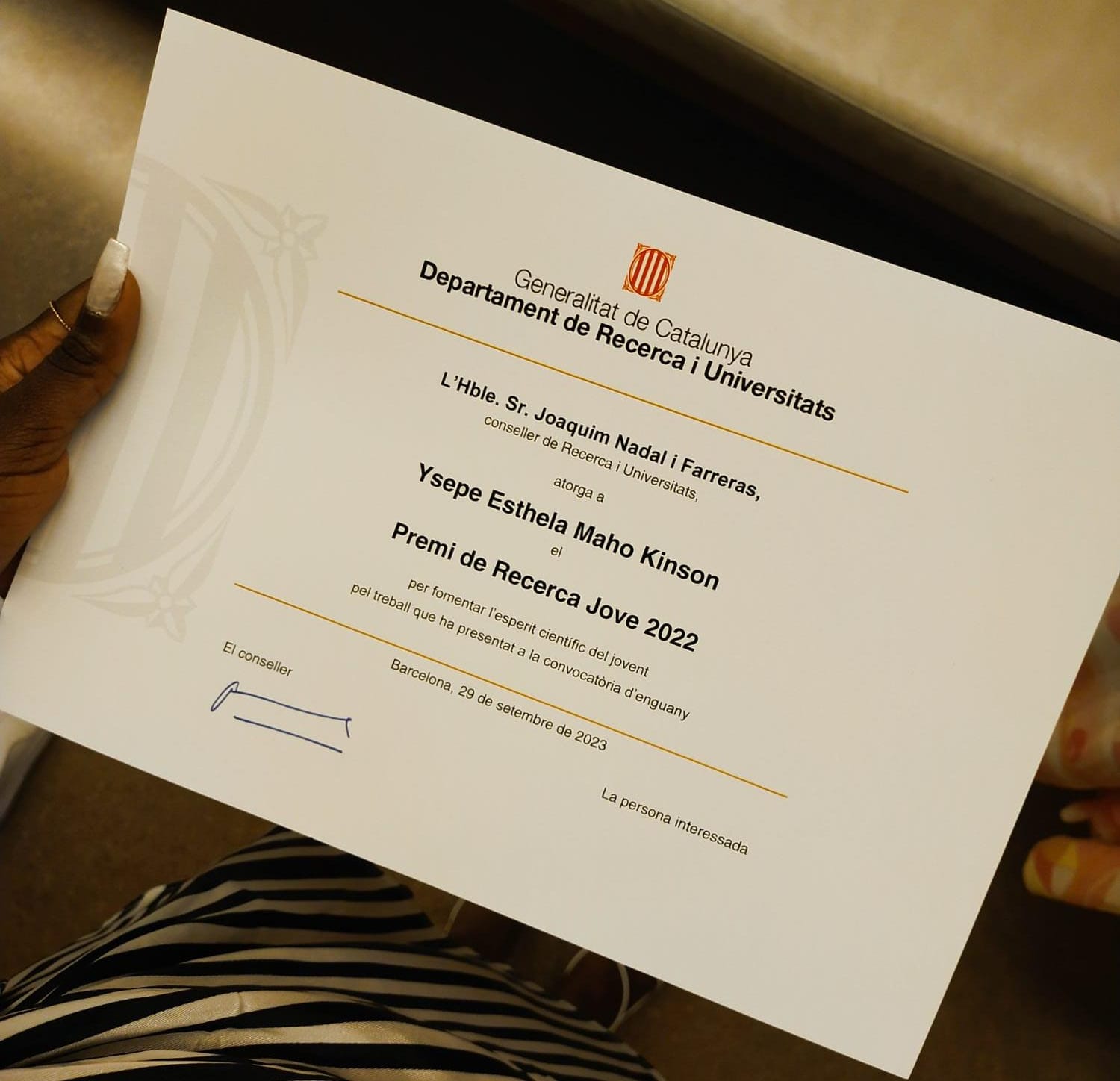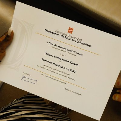 La nostra exalumna Ysepe Esthela Maho Kinson va recollir un nou premi pel seu treball de recerca de Batxillerat. Va ser en el marc de l’acte de lliurament dels Premis de Recerca Jove 2022 que atorga el Departament de Recerca i Universitats de la Generalitat de Catalunya i que tenen com a objectiu fomentar l’esperit científic del jovent; l'acte es va celebrar a l’Auditori de Barcelona i va ser presidit pel Conseller de Recerca i Universitats de la Generalitat de Catalunya Joaquim Nadal. El premi està dotat amb 850€ per a l’alumna.