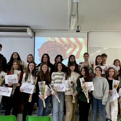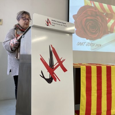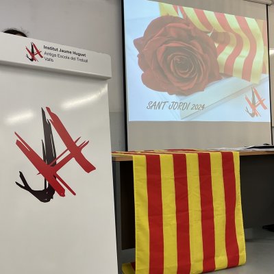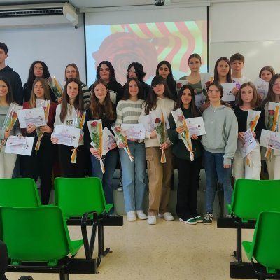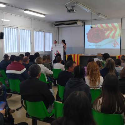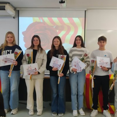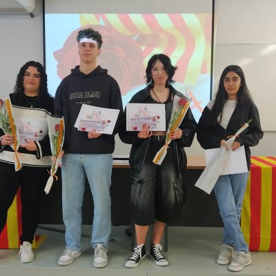 Aquest matí hem començat a celebrar Sant Jordi a l’Institut amb l’acte de lliurament dels premis del 27è Concurs literari que organitzen els departaments de Llengua catalana i de Llengua castellana del centre. Enguany s’ha fet en format reduït, a l’aula d’audiovisuals del centre i hi han assistit els alumnes guardonats i els seus familiars.