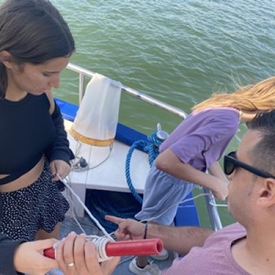 Després d’una hora llarga d’autobús arribem al Camp d’Aprenentatge del Delta de l’Ebre, a Sant Carles de la Ràpita. Deixem l’equipatge i ens dirigim a les aules de les instal·lacions on comencem la classe del dia. Ens expliquen que aquell matí anirem en vaixell per la Badia dels Alfacs. Algú se sorprèn, ja que es pensava que anàvem de colònies sense fer feina! Més tard, agafem la motxilla i caminem fins al port, on ens espera el nostre vaixell. Quina experiència més bonica i emocionant! L’embarcació té dues parts: la part alta −on el sostre és descobert i pots observar la serralada del Montsià i la Punta de la Banya− i la part baixa −on mesuraves termes de la badia i recollies plàncton.