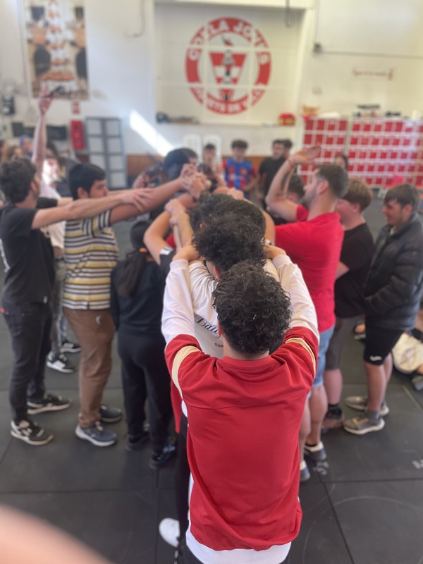Després de la part teòrica, els estudiants van tenir l’oportunitat d’aplicar el que havien après en una sessió pràctica emocionant. Sota la guia experta dels membres de la Colla Joves, van treballar en equip per tancar una pinya i construir un petit pilar, experimentant la necessitat de coordinació, força i confiança mútua.