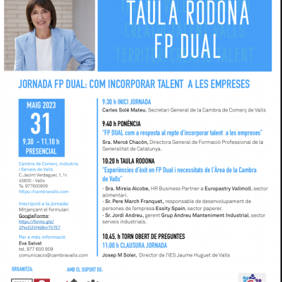 El 31 de maig, a la Cambra de Comerç de Valls, va tenir lloc una jornada sobre "Com incorporar talent a les empreses". Mercè Chacón, directora general d’FP de la Generalitat de Catalunya va fer la ponència inicial en què parlà del valor de l’FPDual dins la Formació Professional a Catalunya, de la importància de les competències professionals i transversals i de la indústria 4.0.