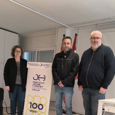 Gerard Rosanes, representant de Carbonell Figueras, Neus Budesca, coordinadora d’FP dual de l'Institut, i Jordi Esqué, coordinador del cicle d'Excavacions, van signar el conveni empresa-institut.