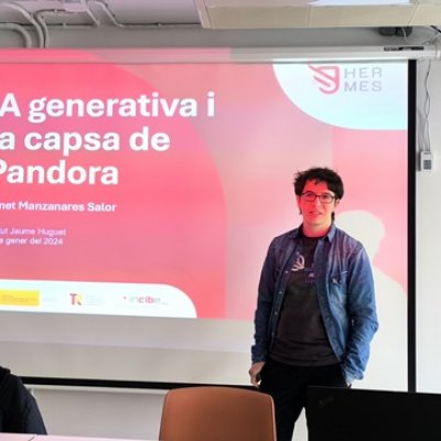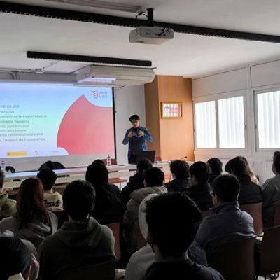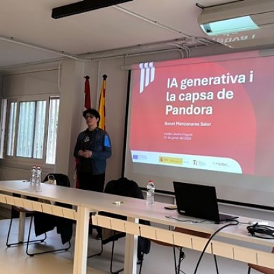 “IA generativa i la capsa de Pandora” és el títol de la xerrada que va fer Benet Manzanares, doctorant d’ETSE de la URV, als alumnes d’informàtica. El Benet, que està fent recerca sobre IA, va explicar-los com funcionen els models d’aprenentatge de la intel·ligència artificial amb diferents passos com ara entrenaments, prediccions, etc.